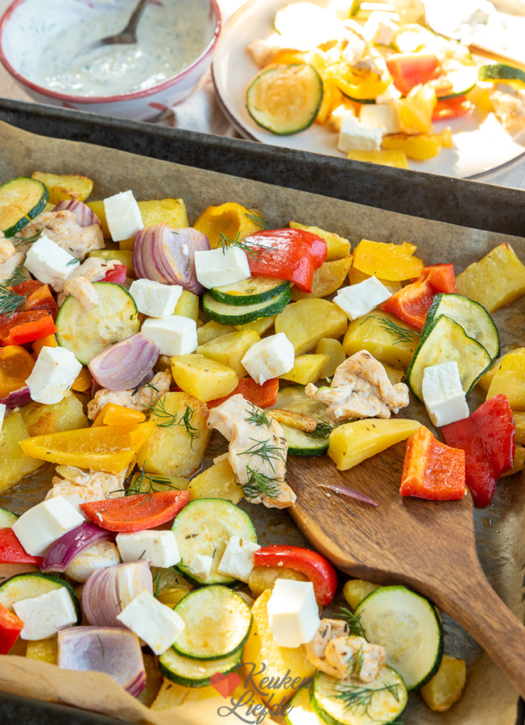Ik vind het lekker als de feta een beetje warm is maar op het eind erop doen kan natuurlijk ook. De knoflook wordt lekker zacht en mild van smaak en kun je naderhand zo uit het velletje knijpen en opeten.