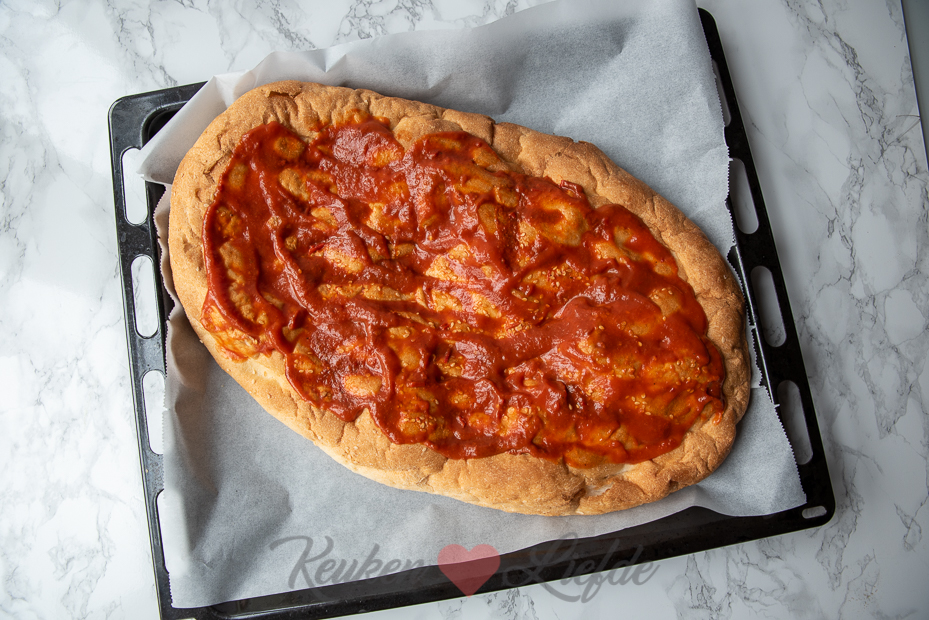 Leg het Turkse brood op het bakblik en bestrijk met een paar eetlepels tomaten frito (houd de randen vrij) en wat rozenharissa. Verdeel het gehaktmengsel eroverheen en bestrooi royaal met geraspte kaas.