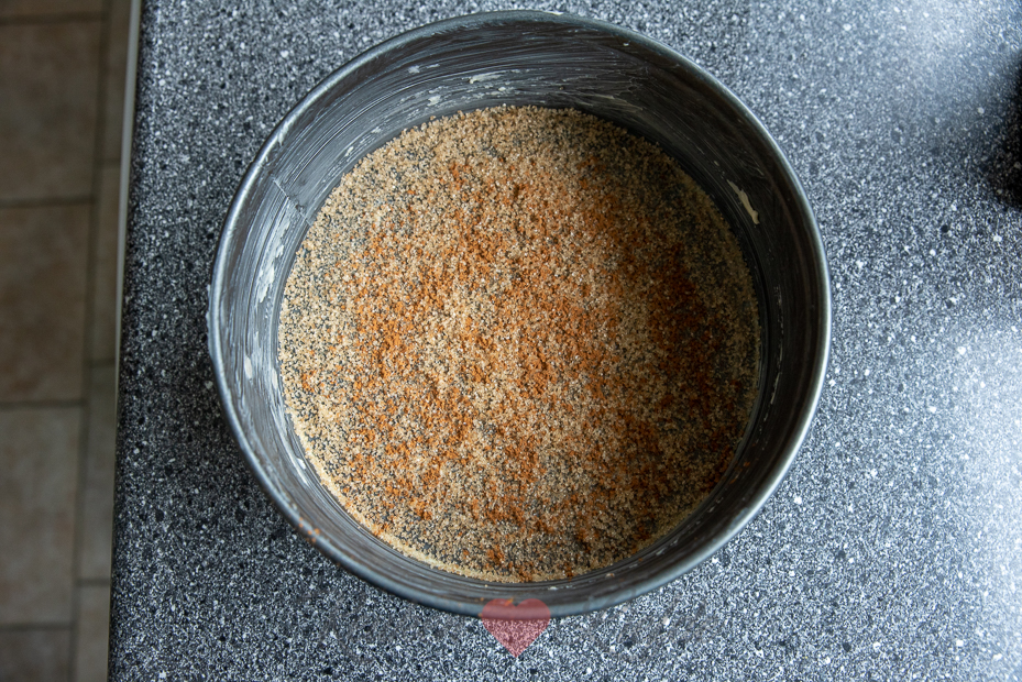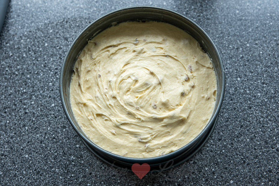 Zeef het bakmeel boven het cakebeslag en spatel er luchtig doorheen. Spatel ook de walnoten en hazelnoten door het beslag. Verdeel het cakebeslag over de appels in de springvorm en strijk de bovenkant glad.