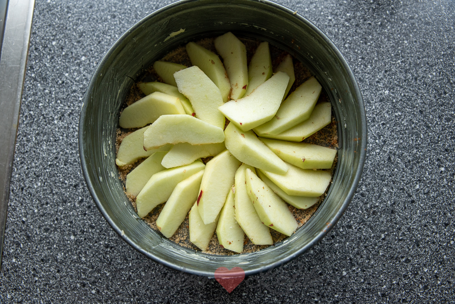Verwarm de oven voor op 160 graden. Vet de springvorm en vooral de bodem royaal in met de klont roomboter. Bestrooi de bodem met de rietsuiker en kaneel. Draai de vorm rond zodat de suiker en kaneel gelijkmatig over de bodem zijn verdeeld. Let op dat er geen suiker op de randen van de springvorm komt. Verdeel de appelpartjes over de bodem.
