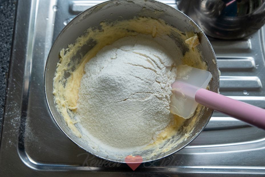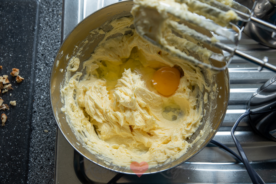 Klop ondertussen de boter en de suiker in een kom tot een luchtig en romig mengsel. Dit duurt zeker 5 tot 10 minuten. Voeg één voor één de eieren toe en klop door het beslag, voeg steeds pas het volgende ei toe als de vorige is opgenomen.