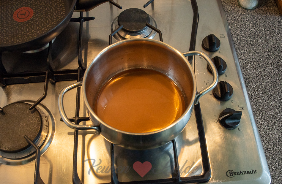 Maak ondertussen de rum-suikersiroop. Doe de rum, water en suiker in een steelpannetje en breng aan de kook. Roer over de bodem van de pan om de suiker te laten oplossen. De rum-suikersiroop is goed als de suiker volledig is opgelost en het mengsel iets dikker begint te worden. Dit duurt 5 tot 10 minuten. Zet het vuur uit en laat iets afkoelen.