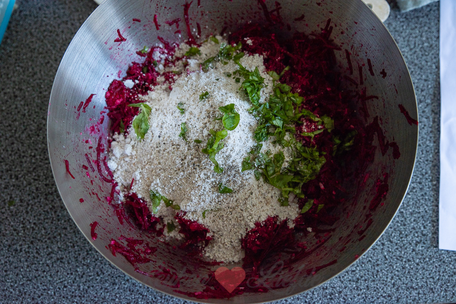 Het bietenmengsel moet stevig genoeg zijn om mooie burgers van te vormen. Als het mengsel te nat is kun je extra havermeel (paneermeel of panko kan ook) toevoegen. Als het mengsel te droog is kun je wat van het opgevangen bietensap toevoegen.
