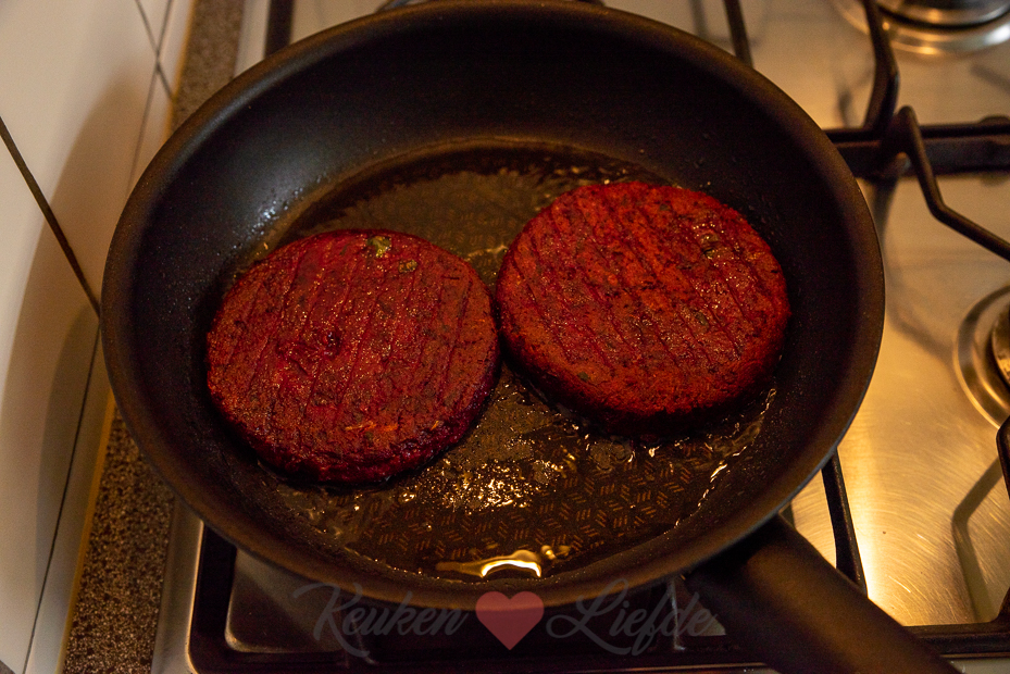 Verdeel het bietenmengsel in 6 gelijke stukken en vorm hier mooie burgers van (ik gebruikte hiervoor een hamburgerpers, maar met je handen kan ook). Leg de bietenburgers op een bord (leg een velletje bakpapier tussen de burgers als je ze op moet stapelen) en zeg ze minimaal 15 minuten, tot maximaal 24 uur in de koelkast (je kunt ze ook invriezen!). Door ze voor het bakken te koelen worden de burgers steviger en kun je ze beter bakken.