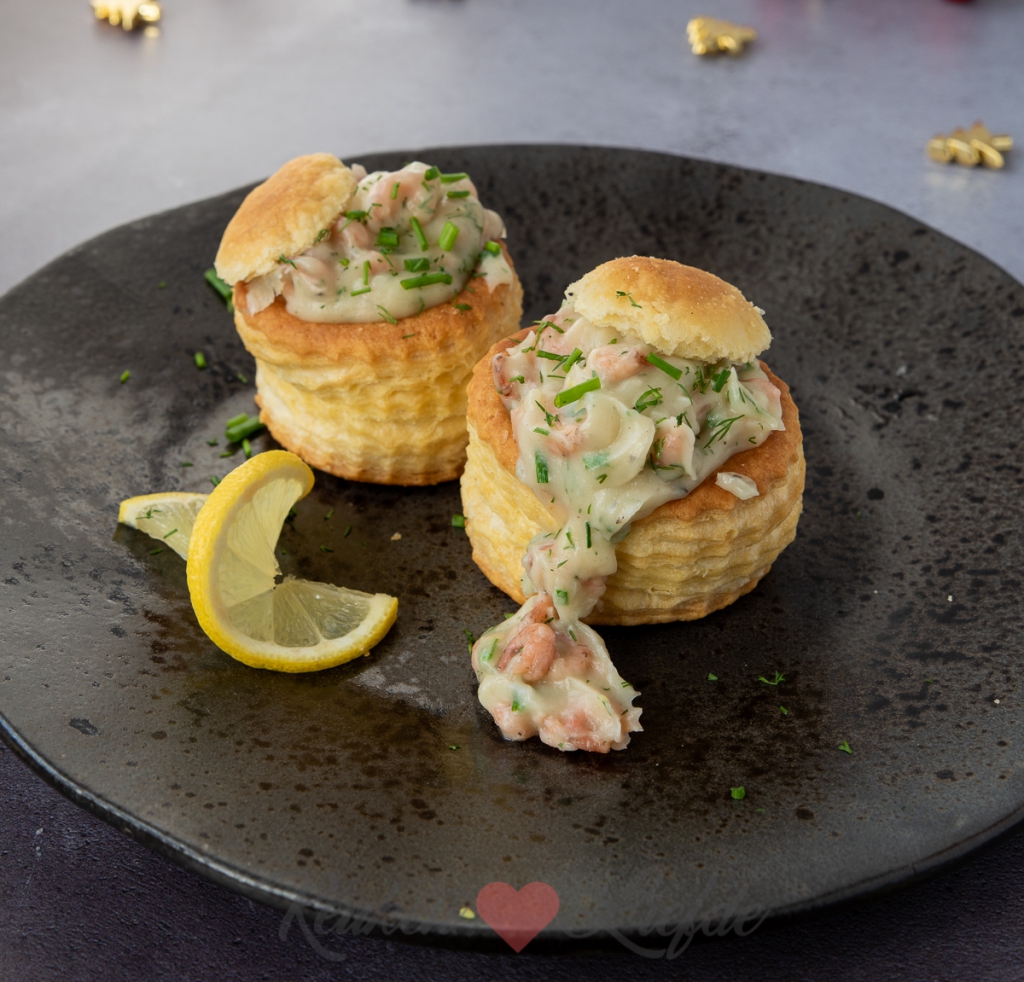 Voeg de Hollandse garnalen, dille en bieslook toe en warm kort even door. Schep de ragout in de pasteibakjes en serveer direct.