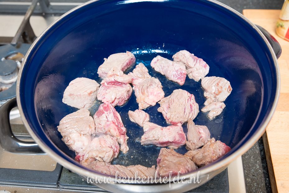 Verhit de braadpan met wat vloeibare bakboter en bak 1/4 van het vlees lichtjes aan. Bestrooi met zout en peper. Let op dat je het vuur niet te hoog zet, want dan wordt het vlees taai. Schep het vlees uit de pan — het vlees mag hier en daar nog zichtbaar rood zijn — en leg op een bord. Bak op dezelfde manier de rest van het vlees, steeds in kleine porties.