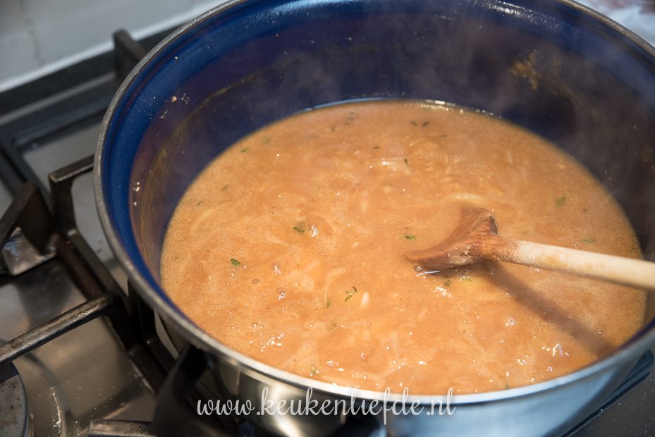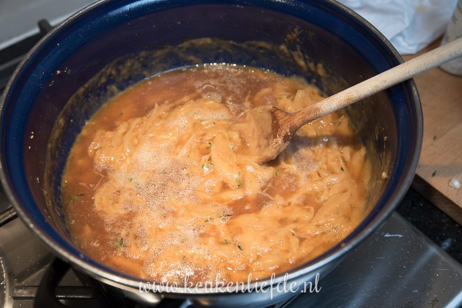 Verhit wat extra boter in de braadpan en bak de uien in het braadvet van het vlees totdat ze beginnen te kleuren. Voeg de knoflook en tijmblaadjes toe en bak even mee. Voeg nog een extra kneep boter toe en 2 el bloem. Bak al roerend op middelhoog vuur verder, totdat de bloem gaar is — dit duurt minimaal 2 minuten! De bloem moet volledig oplossen in de boter, als de bloem zichtbaar blijft voeg dan nog wat extra boter toe.