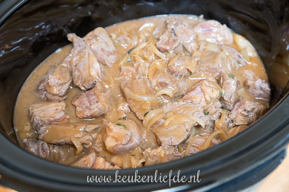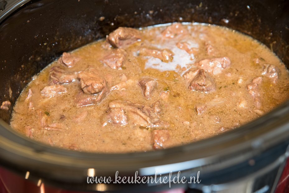 Haal het vlees ruim 1 uur van tevoren uit de koelkast en laat op kamertemperatuur komen. Verwarm de slowcooker voor op stand high.