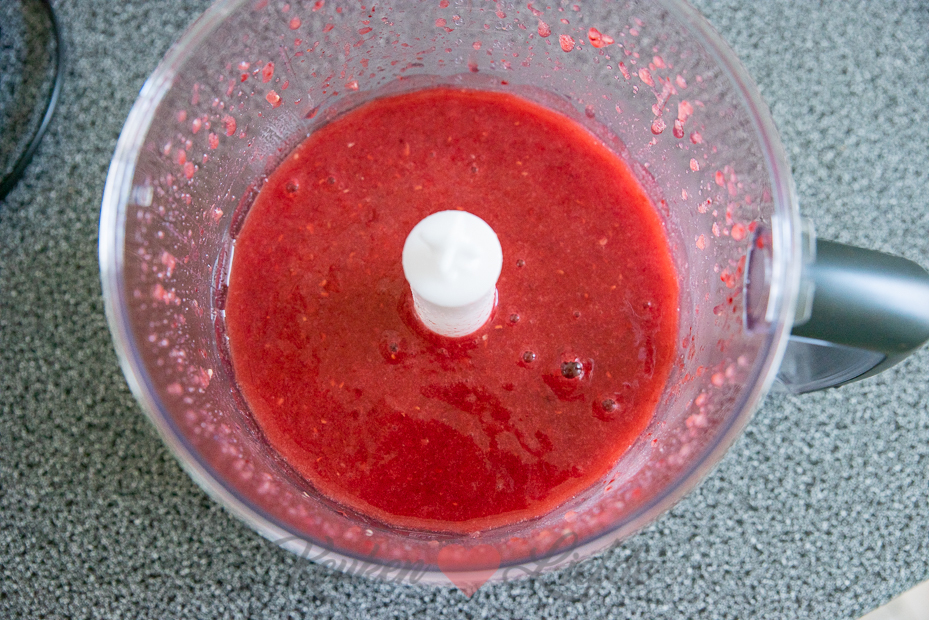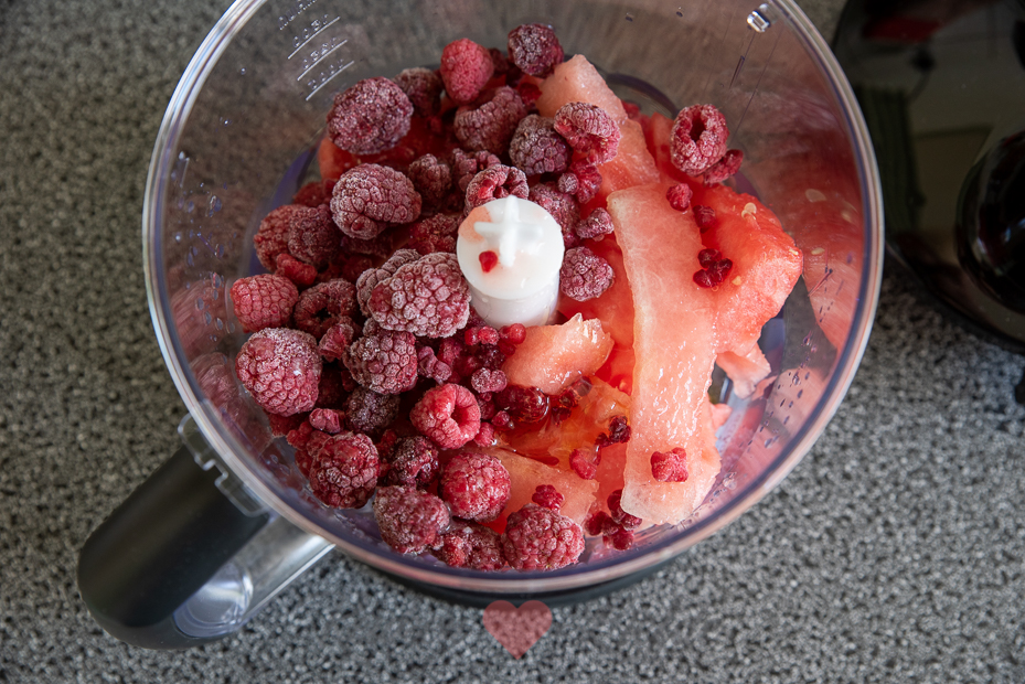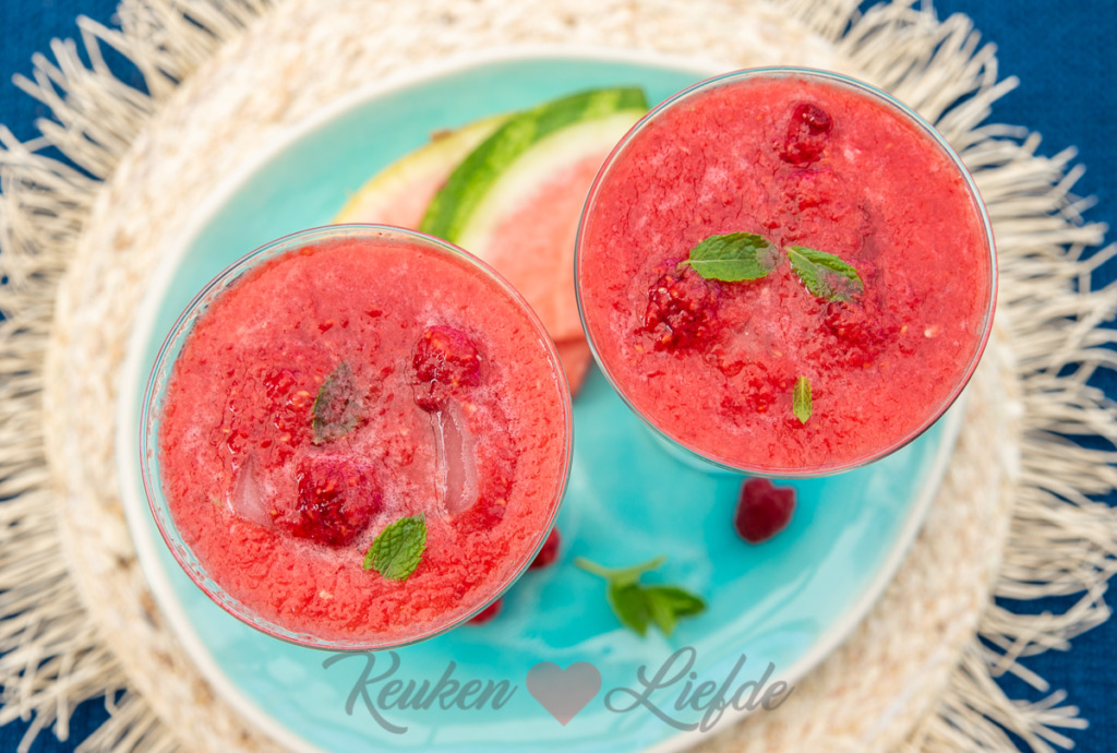 Doe de watermeloen, frambozen (houd een paar frambozen achter de hand voor garnering), citroensap en naar smaak een kneep honing in de keukenmachine of staafmixer en mix fijn. Indien gewenst kun je de cocktail zeven om de frambozenpitjes eruit te halen. Ik laat ze lekker zitten. 🙂 Als je de cocktail te dik vindt kun je hem aanlengen met wat bruiswater.