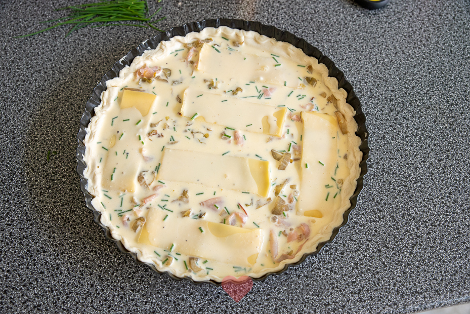 De witlof en ham worden eerst gebakken in de koekenpan voor een lekkere smaak. Daarna gaan ze samen met de romige eivulling en kaas in de bakvorm in de oven. Je kunt dit al voorbereiden en de quiche afgedekt in de koelkast bewaren. Voordat je wilt eten hoef je de quiche alleen maar af te bakken in de oven.