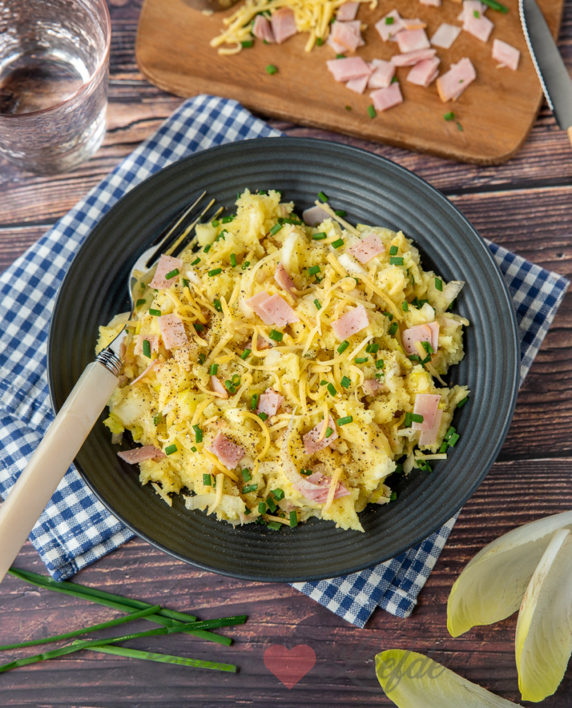 Hoi Hanneke, je hoeft de witlof niet eerst voor te koken. Door de warmte van de puree (die op een laag pitje staat) slinkt de witlof vanzelf (net zoals bij rauwe andijvie). Als je de witlof door de warme puree hebt geroerd en even doorgewarmd hebt kun je het vuur uitzetten en nog even laten staan met de deksel op de pan. Dan slinkt de witlof nog verder. Wil je de witlof toch liever voorkoken, dan kan dat natuurlijk ook. Laat hem dan wel goed uitlekken voordat je hem toevoegt.