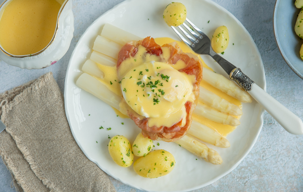 Na een jaar wachten kunnen we eindelijk weer genieten van het witte goud. Hoe eet jij ze het liefst? Ik heb in de loop der jaren al behoorlijk wat aspergegerechten met je gedeeld, maar de klassieke variant met ham, ei en hollandaisesaus blijft toch wel mijn favoriet. Toch geef ik er dit keer een kleine twist aan met krokant uitgebakken parmaham en een gepocheerd ei. De hollandaisesaus maak ik zelf, dat is heel makkelijk en superlekker. Vind je een gepocheerd ei en zelfgemaakte hollandaisesaus toch teveel gedoe, dan kun je ze vervangen door een (zacht) gekookt ei en kant-en-klare hollandaisesaus. Dat is nog steeds genieten.