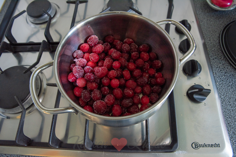 Verwarm de cranberry’s met 1 eetlepel witte basterdsuiker en 2 eetlepels water in een pannetje op laag tot middelhoog vuur tot ze hun sap loslaten en wat zachter zijn, dit duurt circa 10 minuten. Druk door een fijne zeef en vang het sap op. Zet opzij.