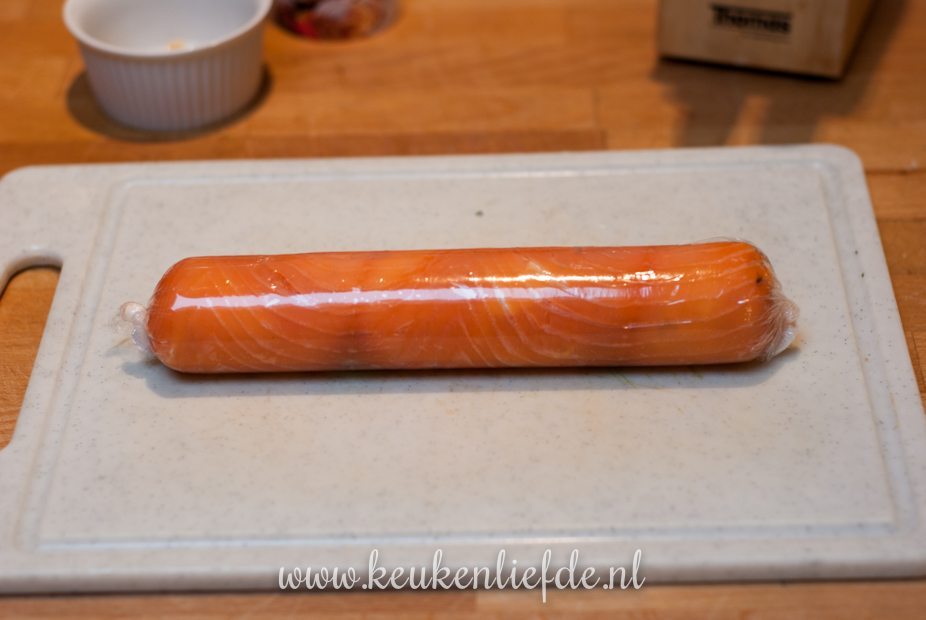 Verwijder het folie en snijd de zalmrol met een vlijmscherp mes in plakken. Leg op een mooie schaal en laat de rolletjes ontdooien.