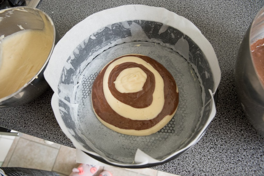 Schep twee eetlepels van het gele beslag in het midden van de springvorm. Schep daarna twee eetlepels van het bruine beslag in het midden van het gele beslag. Schep nu weer twee eetlepels geel beslag in het midden van het bruine beslag. Blijf dit herhalen tot al het beslag op is. Je hoeft het deeg niet te helpen door het glad te strijken, het zebrapatroon wordt vanzelf zichtbaar.