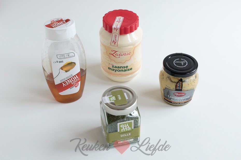 Roer de mayonnaise, mosterd, honing en dille door elkaar en proef of je hem lekker vindt. Als je wilt kun je nog wat extra honing of dille toevoegen.