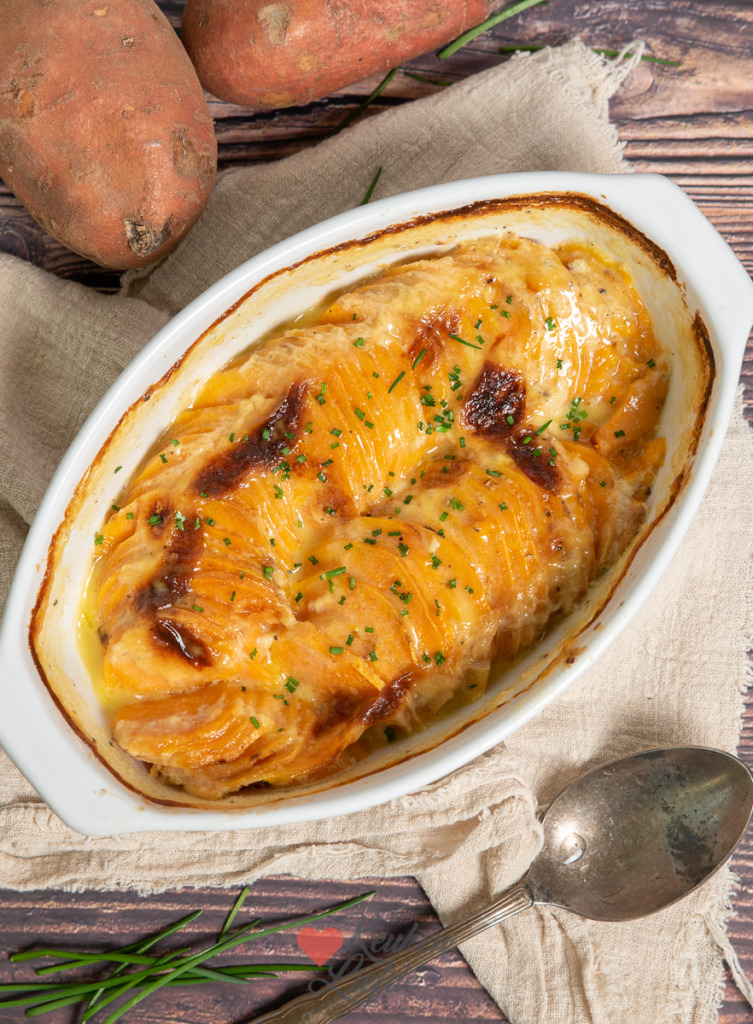 Ben je dol op aardappelgratin? Dan ga je vast en zeker ook smullen van deze zoete aardappel gratin. Dunne plakjes zoete aardappel in een romige saus, gegratineerd in de oven. Gemaakt met maar vier ingrediënten! Een heerlijk bijgerecht om te serveren bij gebraden kip of kalkoen, beenham, spareribs en vis. Sperziebonen zijn ook erg lekker om erbij te serveren.