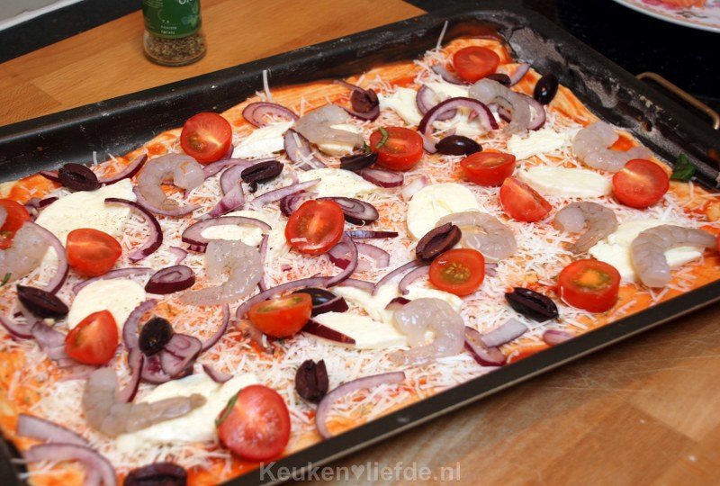 Het eerste wat onze dochter roept zodra het woord pizza valt is; “Jippie!! Mag ik het deeg uitrollen en de saus uitsmeren!” Natuurlijk slaan we haar enthousiaste assistentie in de keuken niet af en mag zij zelf haar eigen hoekje van de vispizza beleggen, die vol komt te liggen met kaas, garnalen en tomaat. Wij laten haar lekker haar gang gaan, want zien met de tijd dat haar hoekje steeds kleurrijker wordt…