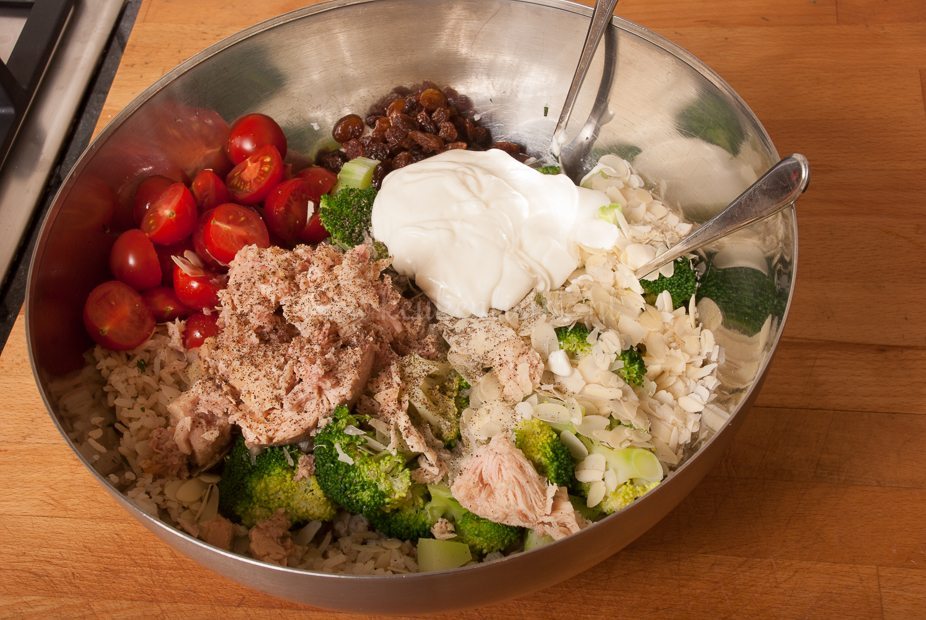 Dit is mijn favoriete lunchgerecht dat ik maak als ik een restje rijst over heb: rijstsalade met broccoli en tonijn. De toegevoegde amandelen, zoete cherrytomaten en rozijntjes maken deze salade tevens tot een echte kindervriend. Mijn dochter is er dol op!