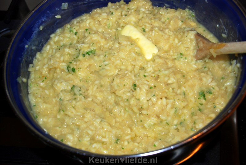 Voeg dan zoveel bouillon toe, totdat de risotto net onderstaat.