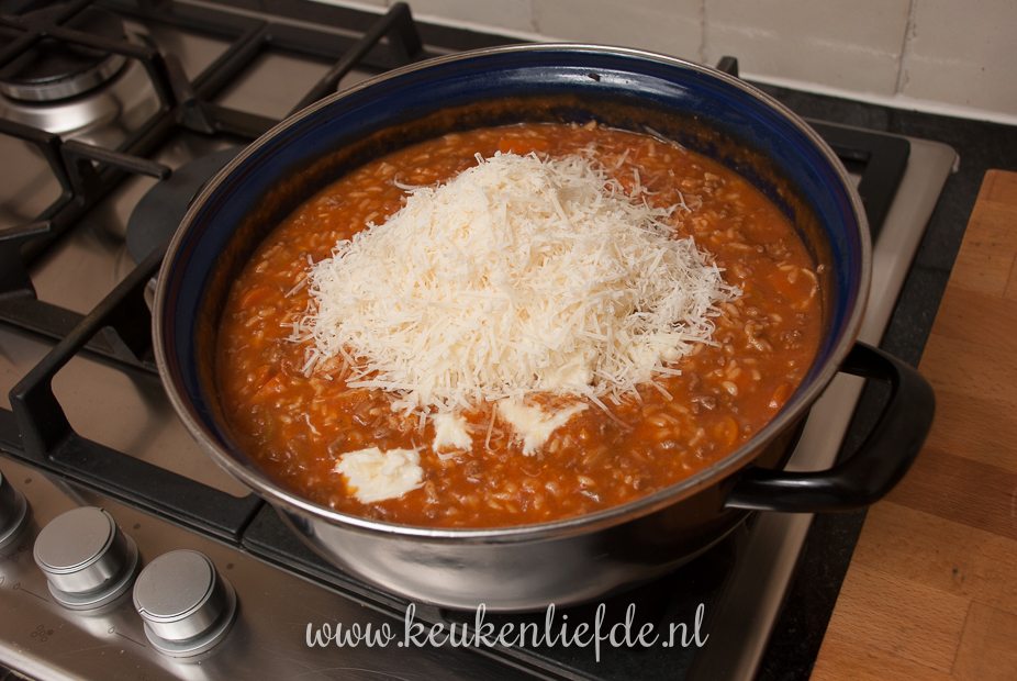 Als de risotto beetgaar is roer je de Parmezaan (houd wat achter de hand voor garnering) en mozzarella erdoor en zet het vuur uit. Laat de risotto drie minuten rusten met de deksel op de pan.