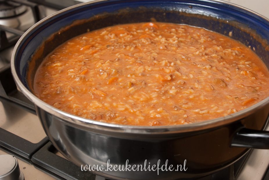 Verhit de pan met olie en fruit de ui, knoflook en ontbijtspek op laag vuur, totdat de ui zacht maar niet gekleurd is. Voeg de wortel en bleekselderij toe en bak kort mee, totdat de randen beginnen te kleuren. Voeg wat extra olie toe als het te snel aanbakt. Voeg het gehakt toe en bak rul. Verkruimel de bouillontabletten eroverheen. Voeg de risotto toe en roer door. Voeg de gezeefde tomaten en oregano toe en roer alles goed door elkaar. Vul het lege pak gezeefde tomaten met water en voeg toe aan de risotto. Roer goed over de bodem om alle aanbaksels los te maken. Zet het vuur op de laagste pit.