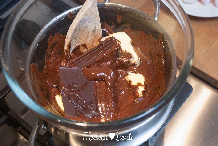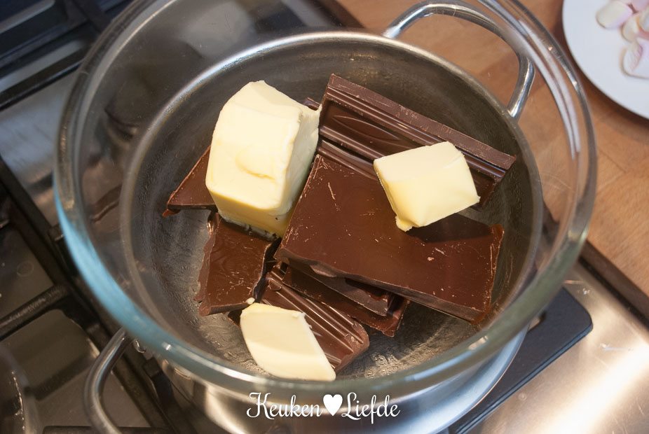 Smelt de chocolade en boter au bain-marie en voeg dan alle overige ingrediënten toe.