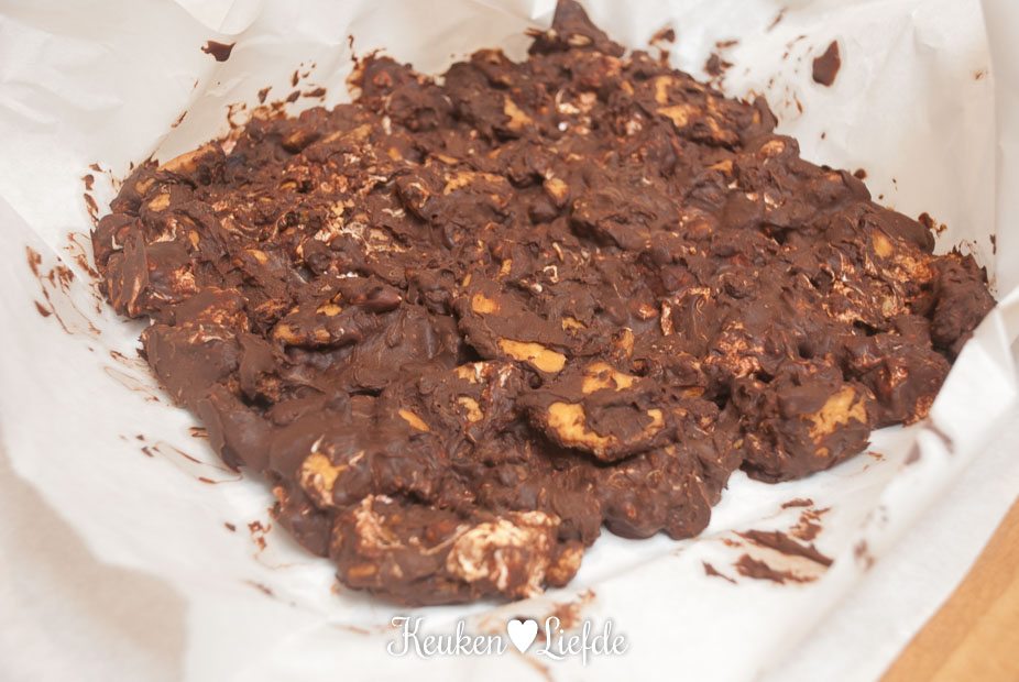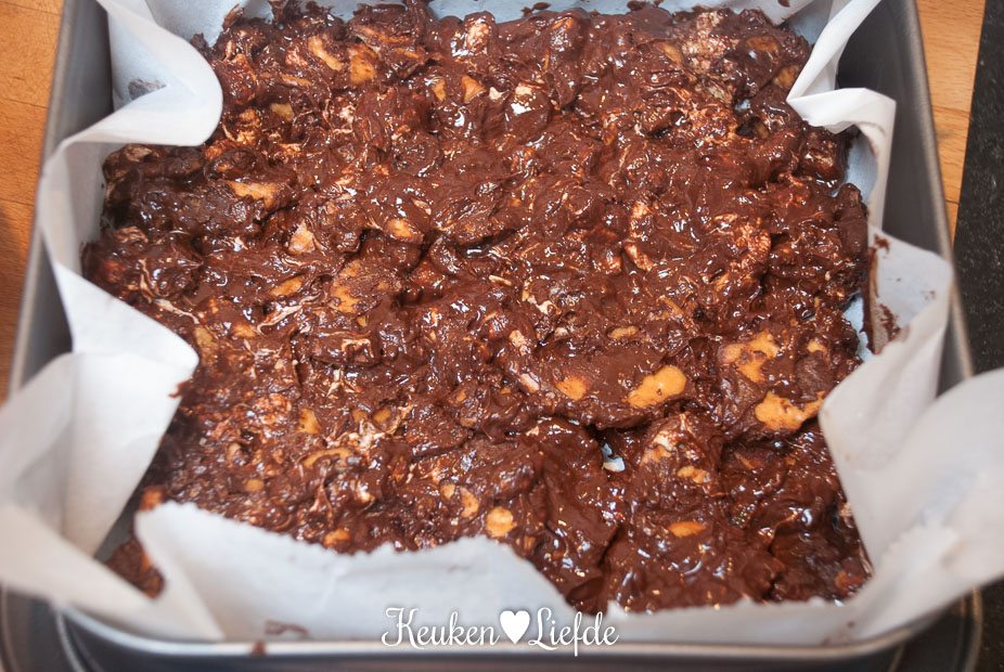 Snijd de rocky road in kleine vierkant blokjes en geniet!