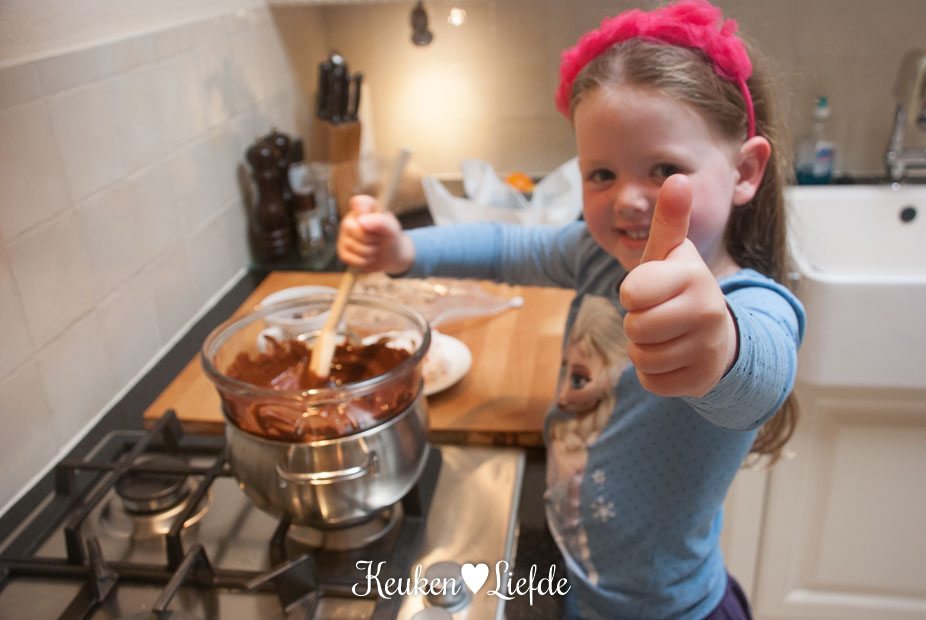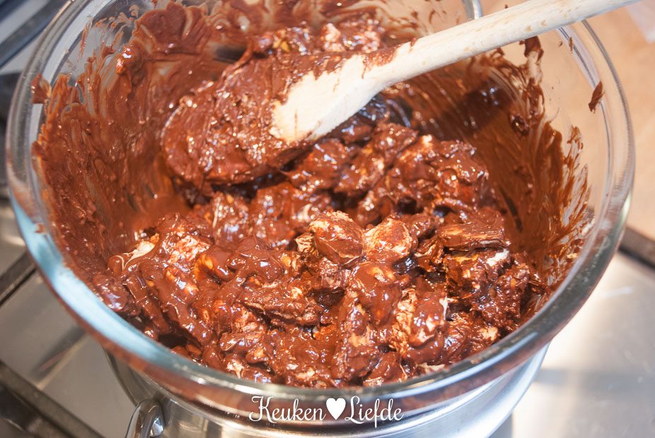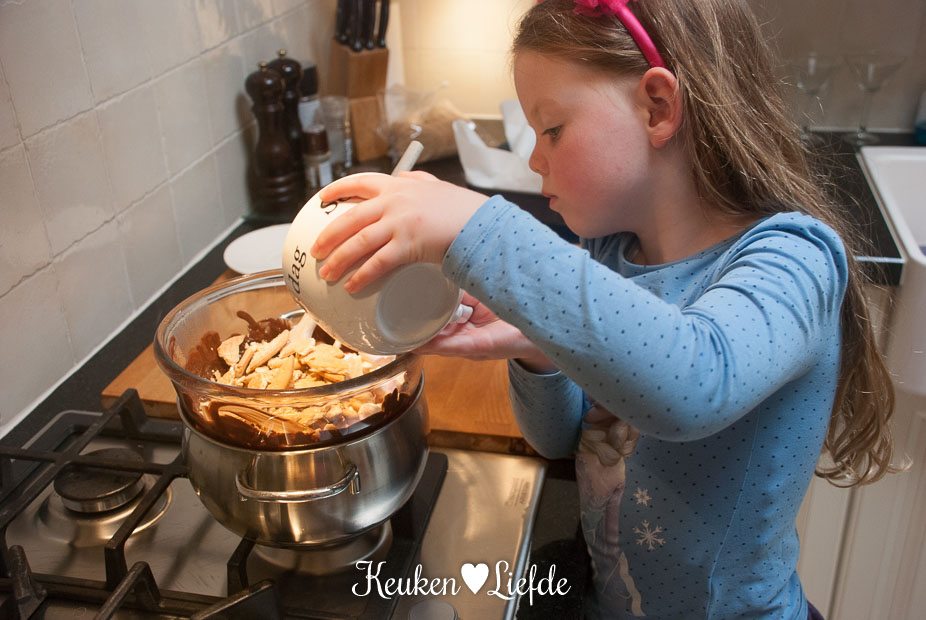 Bovendien kun je met dit recept eindeloos variëren. Gedroogde vruchten, gemende noten, koekjes, marshmallows: alles kan en mag erin. Zo gebruikte ik een notenmix met gedroogde cranberry’s, omdat Ella-Marie daar bijzonder dol op is.