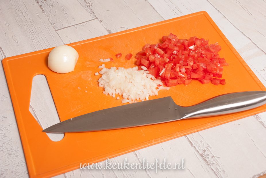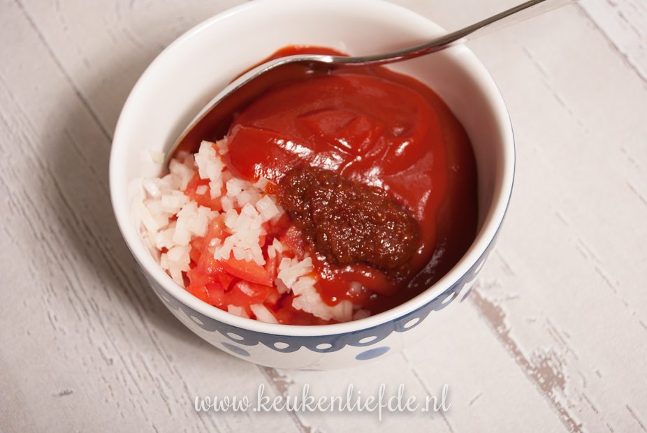 Snijd de tomaten in vieren, verwijder het zaad en sap en snijd het vruchtvlees in hele kleine blokjes. Pel de ui en snipper hem heel fijn. Meng de tomatenblokjes met de ui, sambal, tomatenketchup, olijfolie en circa 3 eetlepels water. Proef of je de saus lekker vindt. Als je hem te zoet vindt, kun je nog wat extra water toevoegen.