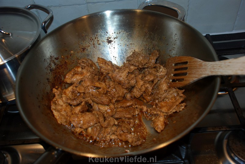 Verhit de wok met wat olie en roerbak het gemarineerde vlees totdat het net gaar is.