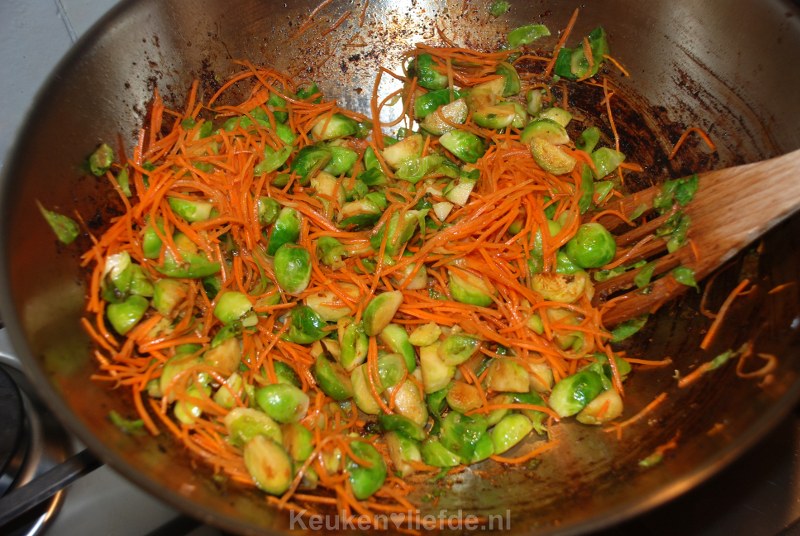 Schep het vlees op een bord en zet zolang opzij. Roerbak de spruitjes 1 minuut in de rest van de olie. Voeg de wortelsliertjes toe en roerbak nog een minuut.