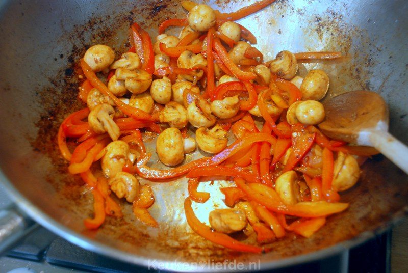 Verwarm de wok opnieuw met 1 el zonnebloemolie en 1 el sesamolie en roerbak op hoog vuur de paprika, circa 1 minuut. Voeg dan de champignons toe en bak nog een minuut verder, totdat de groenten wat zachter zijn, maar nog wel bite hebben.