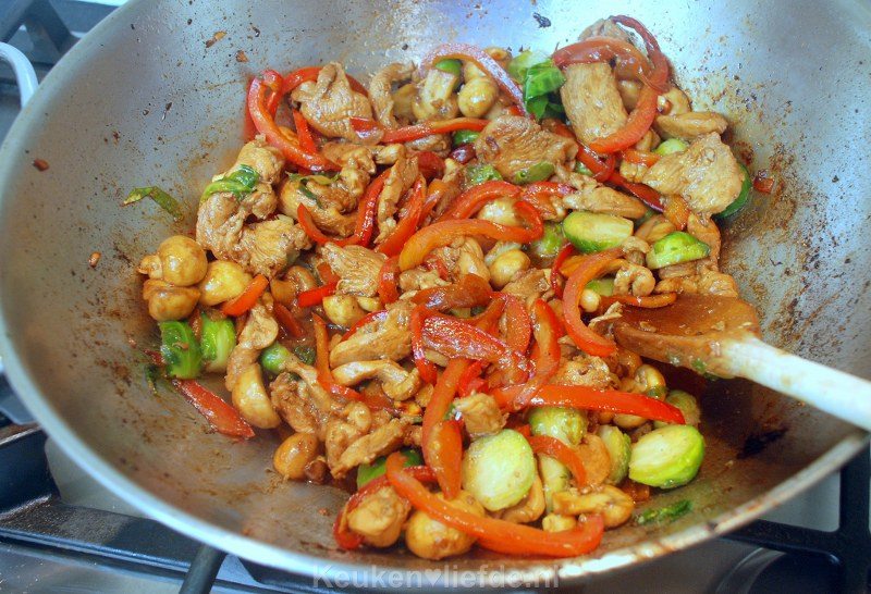 Voeg de groenten, kip, spruitjes en cashewnoten aan de saus toe en warm alles nog even goed door.