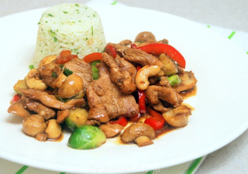 Roerbakkip met cashewnoten en spruitjes
