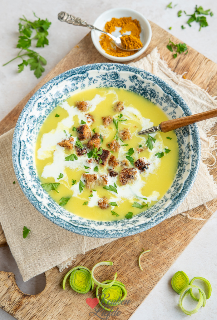 Zin in een snelle en makkelijke soep? Deze romige kerriesoep met prei en aardappel staat in no time op tafel! De aardappel bindt de soep licht en maakt hem fluweelzacht. De krokante broodcroutons maken de soep af.