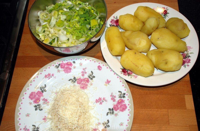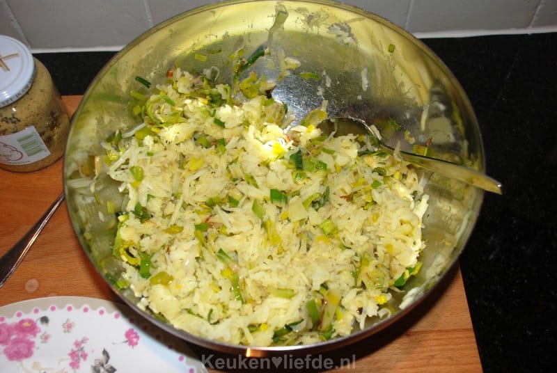 Breng op smaak met zout en peper en laat afkoelen. Schep de prei en geraspte kaas voorzichtig door de aardappel en breng weer op smaak met wat zout en peper.
