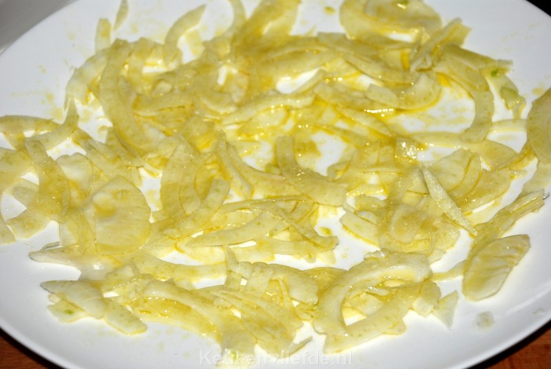 Verwijder het harde gedeelte aan de onderkant van de venkel – dit is niet lekker om te eten – en snijd de venkel doormidden. Bewaar het frisse groen aan de bovenkant voor garnering. Snijd de venkel in zo dun mogelijke plakjes en besprenkel ze met het citroensap en wat olijfolie.
