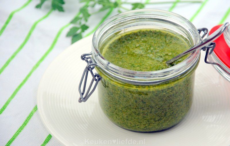 Gooi alle ingrediënten, samen met een scheutje olijfolie in de staafmixer en pureer tot een gladde, groene saus.