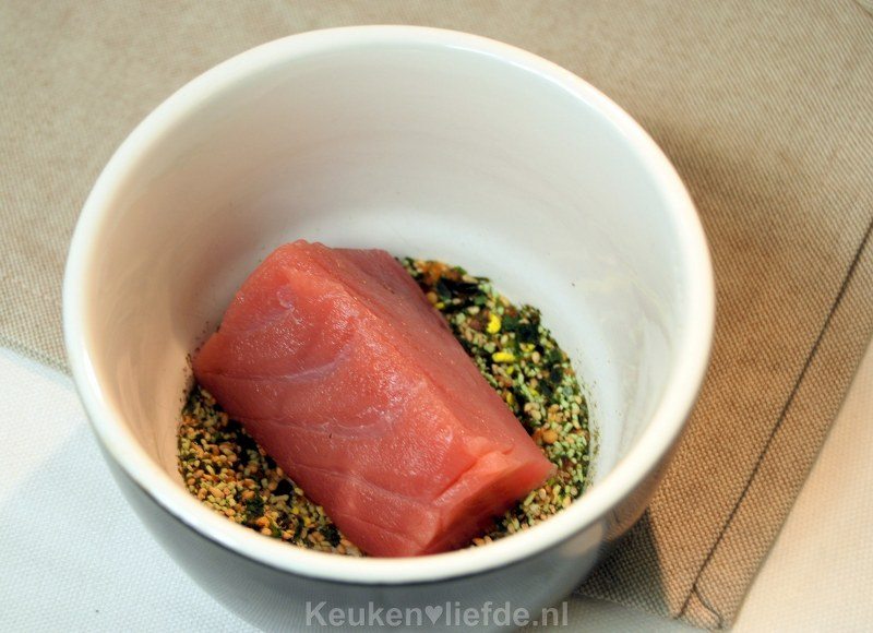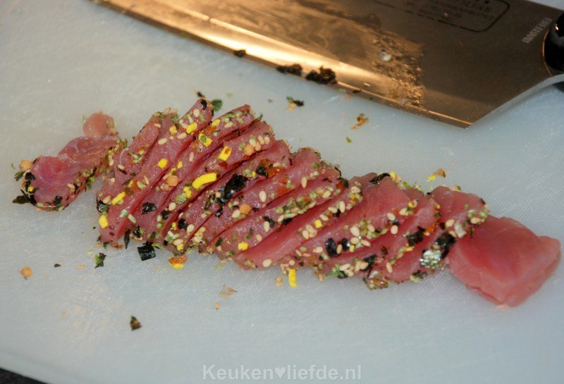 Wentel de tonijn rondom door de furikake en druk lichtjes aan. Snijd met een vlijmscherp mes in dunne plakken.