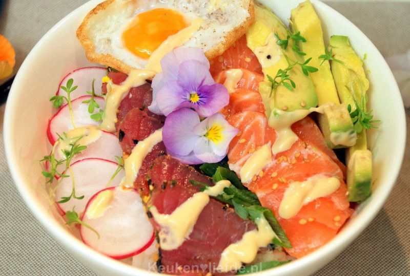 Sashimi bowl met viooltjes