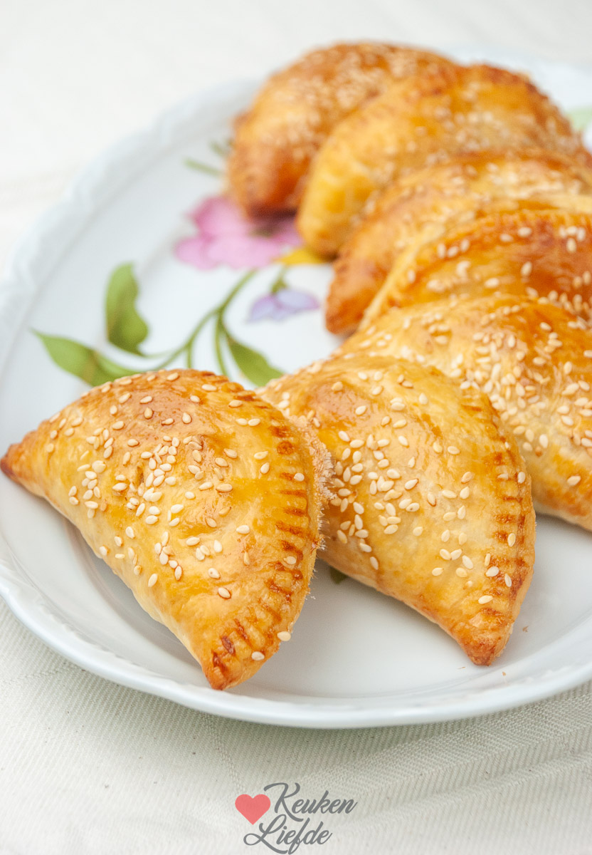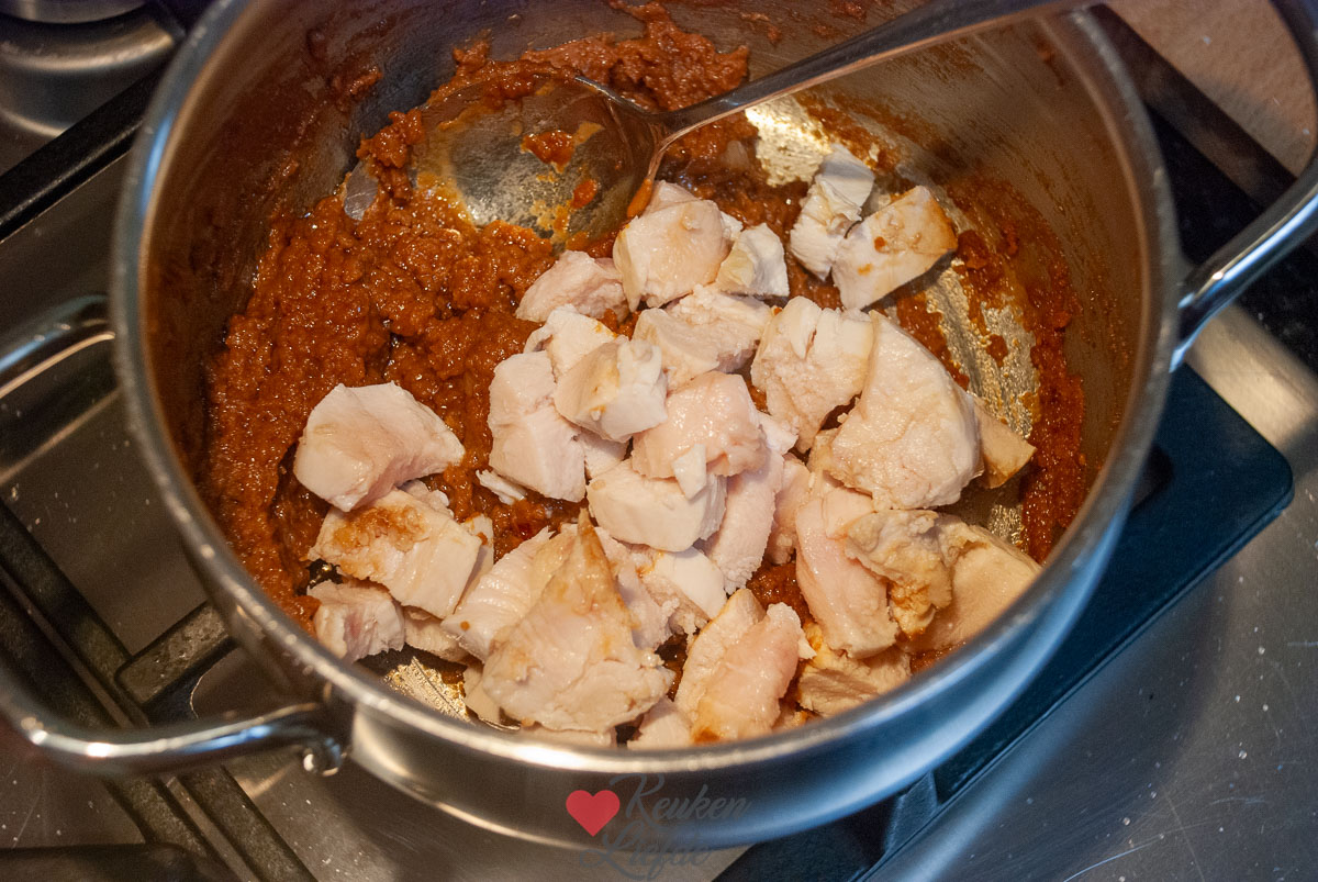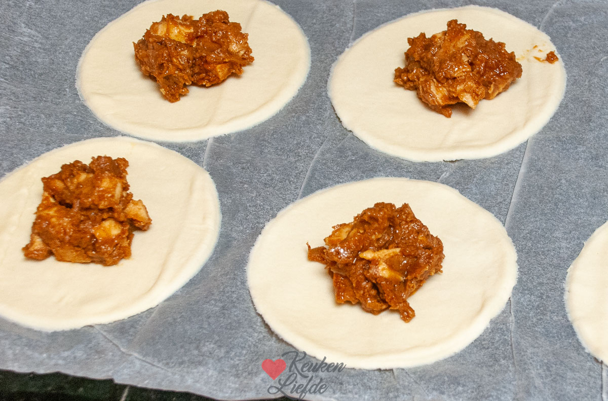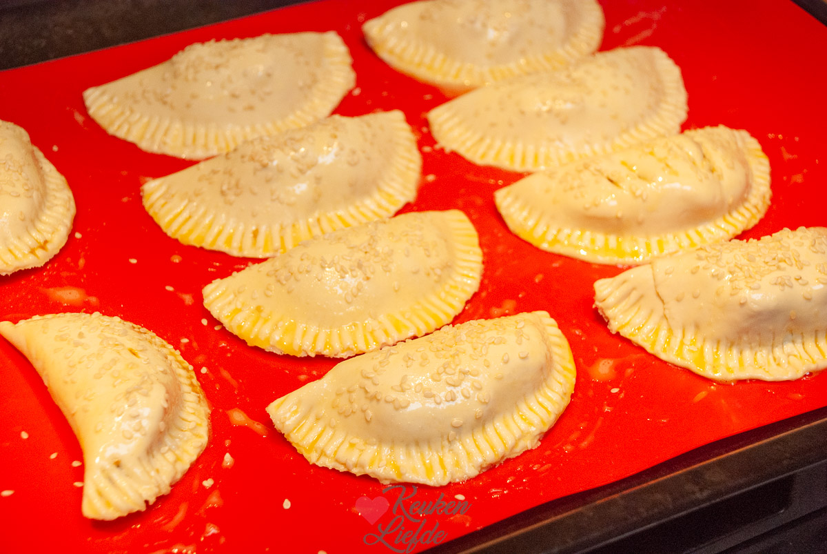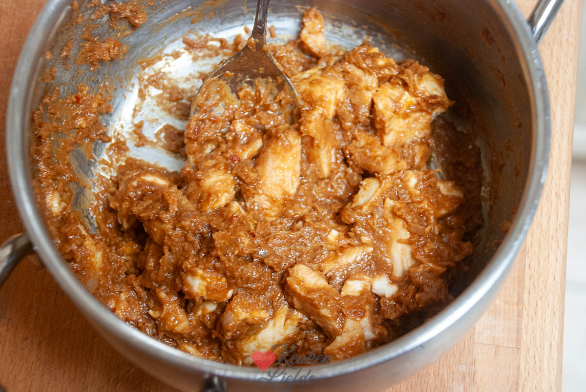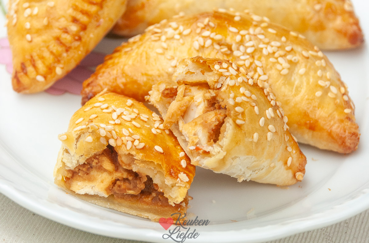 Je gooit de (rauwe) kip met de boemboe, vissaus en het eiwit in de blender, snijdt de bosui fijn en vult hier je pasteitjes mee. Dichtvouwen en hop voor 25 minuten op 180 graden de oven in. Alles gaart in de oven. Aangezien wij nogal van rode curry houden gaat de hele inhoud van het bakje erin 😉 en dan nog wat extra gember voor de smaak!