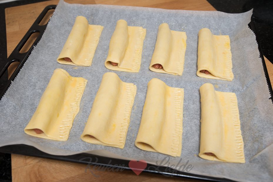 Klop het overige ei los en bestrijk de bovenkant van de saucijzenbroodjes met ei. Leg de saucijzenbroodjes op een met bakpapier bekleed bakblik en bak circa 12 tot 15 minuten in het midden van de oven, of totdat ze goudbruin zijn.