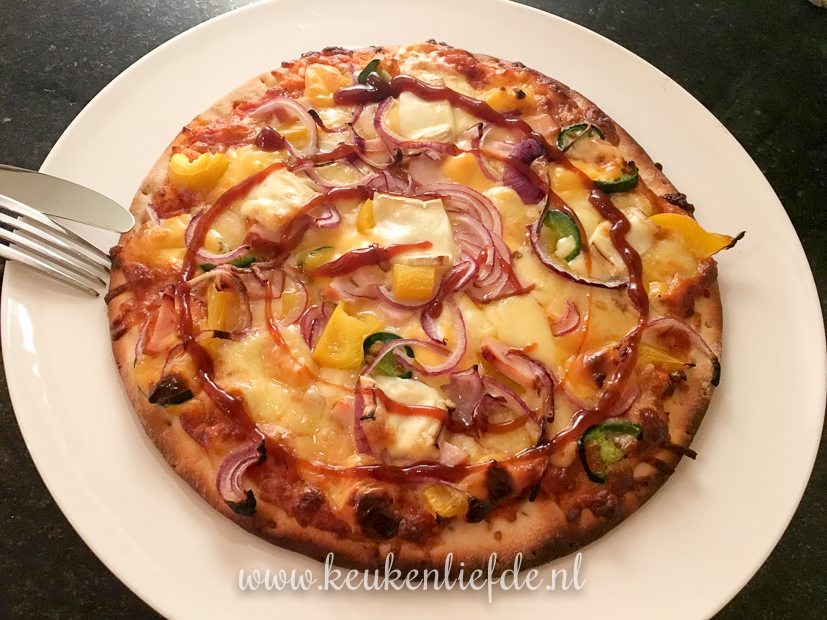 We beleggen de pizza’s extra met van alles wat we maar tegenkomen in de koelkast. Altijd lekker.