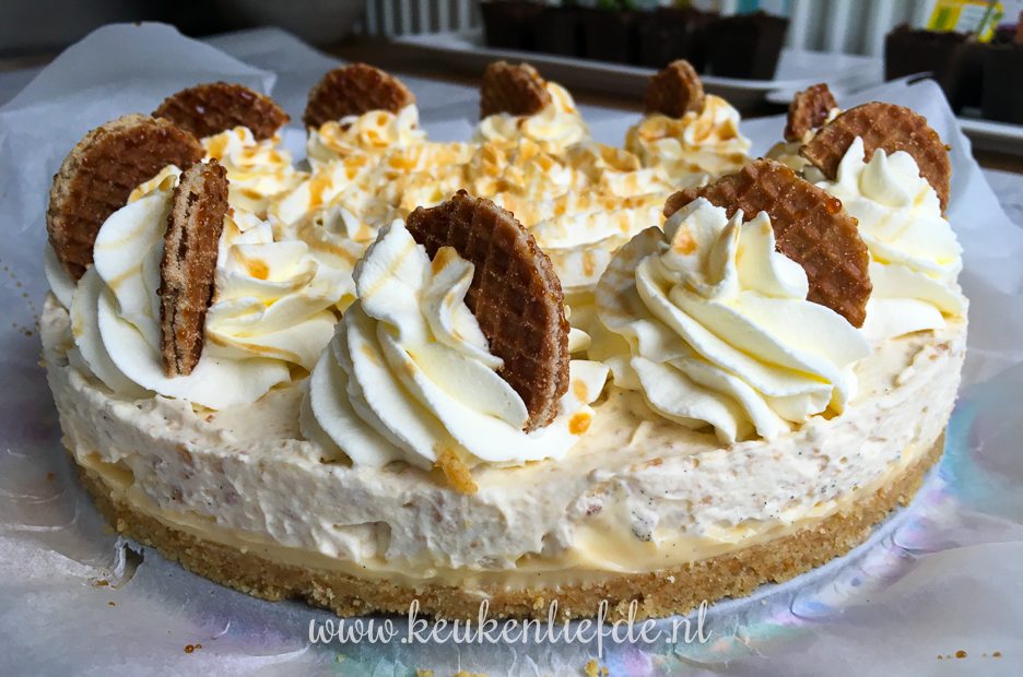 Met mijn vernieuwde creatie ben ik in eerste instantie heel erg blij, maar na het opstijven in de koelkast, zakt de vulling in. Daar moet ik dus wat op verzinnen. Nog heel even geduld dus lieve stroopwafelfans, mijn ultieme stroopwafeltaart laat niet lang meer op zich wachten!