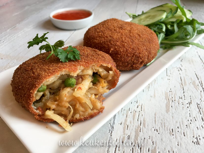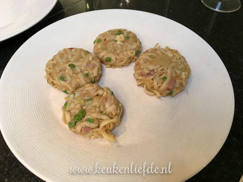 Na het eten duik ik nog even de keuken in. Van het laatste restje bami wil ik bamischijven maken. Ik meng de bami met een dikke saus, strijk dit uit over een bakblik en zet het een nachtje weg in de koelkast om op te stijven. Morgen ga ik ze paneren.