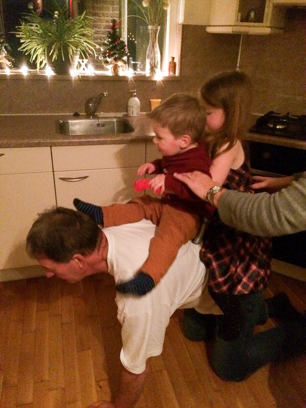 Ella-Marie is door mijn schoonvader uit school opgehaald en we mogen haar pas ’s avonds na het eten weer ophalen ?. Zo kan ik ’s middags nog even doorwerken. Als Johan Ella-Marie gaat ophalen stuurt hij me deze foto door: neef en nicht op de rug van opa. Daar krijgen ze nooit genoeg van!