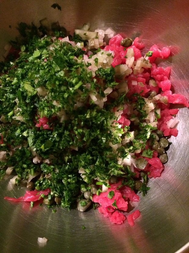 Johan en ik eten ’s avonds ons favoriete maaltje: steak tartaar met zelfgemaakte frieten. Ik zit er serieus over te denken om dit met kerst te eten. Misschien tartaar van Black Angus. Mmmm …
