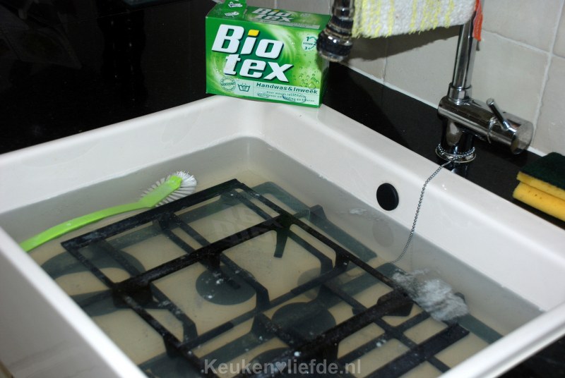 - Schoonmaken met een schuursponsje en ontvetter van de Wibra, Muscle ovenreiniger, of ander merk ontvetter.