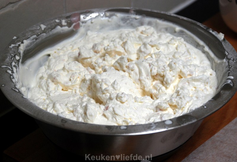 Dit moet je echt heel snel doen want als de gelatine in aanraking komt met de (koude) slagroom, gaat hij direct stollen. Als je dus te lang wacht met mengen krijg je klontjes stolsel in je slagroom.